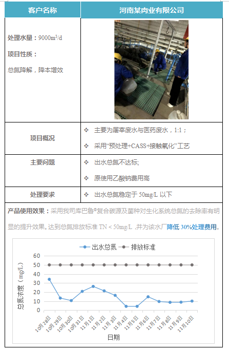技術方案:在不改變水站原有設施的條件下,采用生化系統菌群優化及針對性營養素組合的方案,使用我司復合碳源101b與總氮激活菌101,將系統出水總氮穩定降至15 mg/L以下。